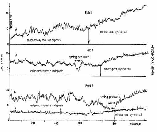 The non-contact electrical profiling method was used for quick mapping of these soils. The area with mineral-peat layered soils is outlined by the highest resistivity (up to 300 ohm m on NEP profile). Resistivity is sharply reduced on peat soils (3 ohm m). Method of NEP provided similar results for the other fields of CPBRS (Fig. 2). From fields 1 to 5 the area of mineral-peat layered and grass-woody soil gradually decreased, whereas the area of sedge-mossy peat soil increased. On the NEP profiles the areas with different genetic types of deposits were characterized by different resistivities. The areas with the resistivity about 3 ohm m characterized presence of sedge-mossy peat in the deposits (Fig. 2). At the transition from mineral-peat layered soils through grass-woody to sedge-mossy peat, the resistivity reduced from 300 to 3 ohm m. The areas with seeping water were possible to detect on NEP profiles as places with the minimum resistivity (Fig. 2). Such extremely low resistivity in spring areas was, probably, because of enrichment of these places with mineral substances (iron and calcium) brought by groundwater.By results of NEP survey we constructed plan of the CPBRS experimental fields, which reflected the basic areas with different peat deposits. The plan agreed with the previous maps of the area developed with conventional geological survey. Based on the distribution of different peat and mineral deposits, an optimal plan of agricultural usage was proposed. Mineral-peat layered soils were recommended to use under intense vegetable production. The rest of the area in fields 1, 2, and 3, especially where seeping groundwater is close to the soil surface, could be used for grass pasture. The whole territory of field 4 and 5 could be used either for pasture or crop rotations of vegetables and grasses. Although such management scheme would reduce usage of soils for high cost vegetable crop, it decreased the cost required for reclamation of these soils and service of drainage systems.